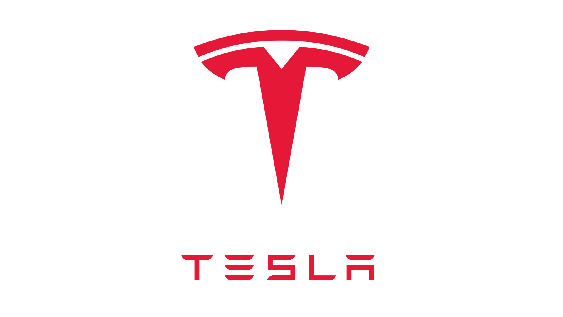 • Tesla logo with the company's name written below in modern red font on a black background.